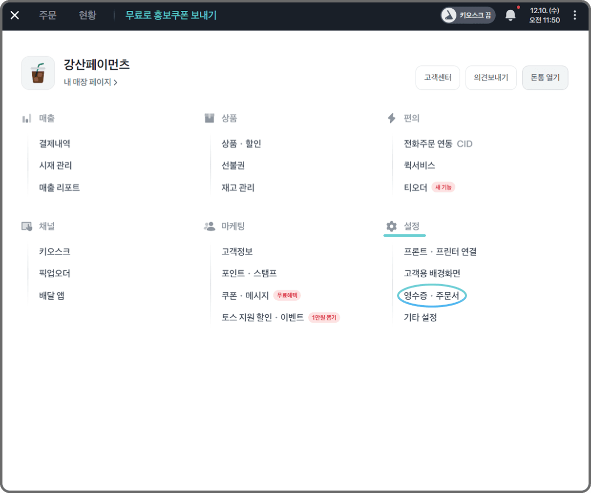 메뉴 중 설정 카테고리 안에 있는 영수증•주문서를 클릭해요.