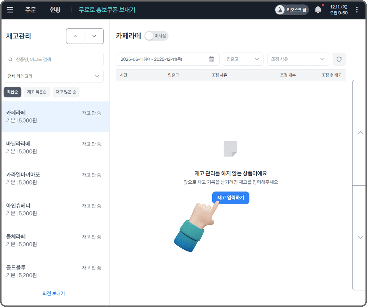메뉴 중 상품 카테고리 안에 있는 재고 관리를 클릭해요.